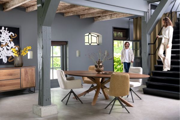 De eetkamertafels binnen de Trapani-collectie worden gekenmerkt door een prachtig ellipsvormige bovenblad en een centrale massief houten poot. Dankzij die centrale poot schuif je makkelijk een extra stoel aan voor een onverwachte gast. Deze tafel is de op-één-na-grootste in het assortiment en heeft een lengte van 240 cm. Alle tafels zijn gemaakt van smoked mangiferafineer, en afgewerkt met een laklaag voor een subtiele glans en extra vlek- en krasbestendigheid.