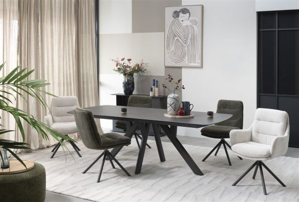 In collectie Vegas van Henders & Hazel vind je 2 verschillende uitschuiftafels in 2 verschillende kleuren marmerlook. Dit is de antracietkleurige versie met een tafelblad van 200cm, dat met een ingenieus systeem te verlengen is tot een tafelblad van 280cm. Deze uitschuiftafels hebben een blad van keramiek op glas en zijn dus uiterst robuust. Daarnaast heeft de tafel een antraciet metalen onderstel dat bijdraagt aan de robuuste look van de tafel. Ook erg leuk aan deze tafels is dat het patroon in de marmerlook over heel het tafelblad doorloopt wanneer de tafel volledig is uitgeschoven.