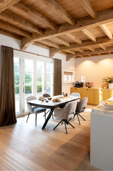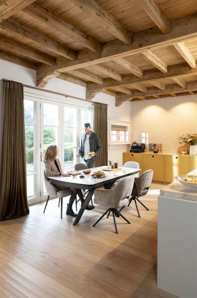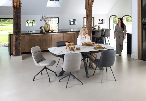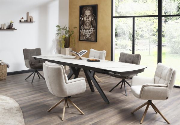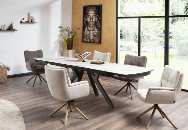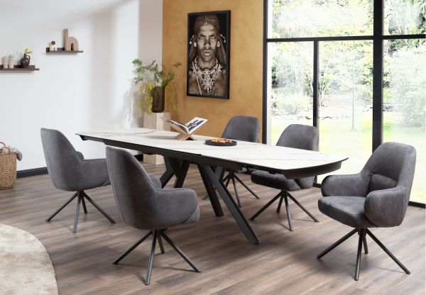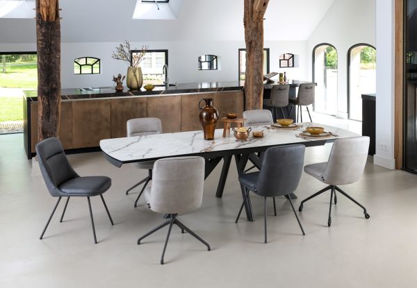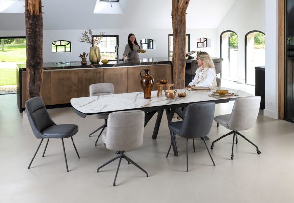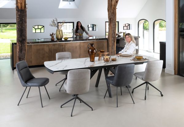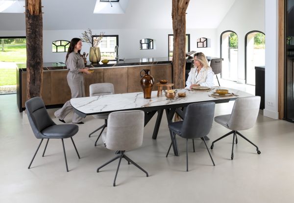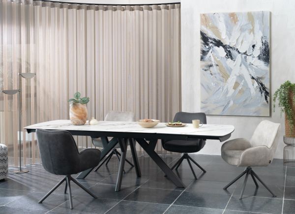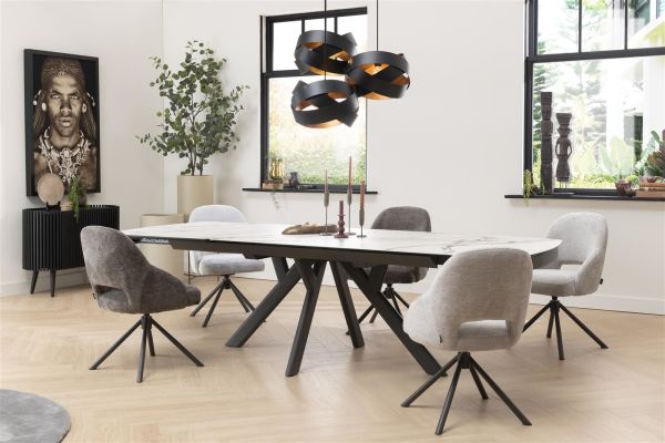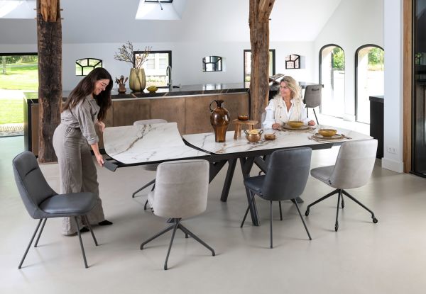 In collectie Vegas van Henders & Hazel vind je 2 verschillende uitschuiftafels in 2 verschillende kleuren marmerlook. Dit is de versie met een wit tafelblad van 200cm, dat met een ingenieus systeem te verlengen is tot een tafelblad van 280cm. Deze uitschuiftafels hebben een blad van keramiek op glas en zijn dus uiterst robuust. Daarnaast heeft de tafel een antraciet metalen onderstel dat bijdraagt aan de robuuste look van de tafel. Ook erg leuk aan deze tafels is dat het patroon in de marmerlook over heel het tafelblad doorloopt wanneer de tafel volledig is uitgeschoven.