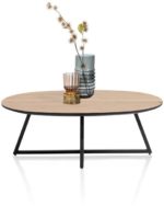 De moderne ovale salontafel uit de Avalon-collectie is in verschillende kleuren verkrijgbaar. Deze variant heeft een blad van Primo Laminato in de kleur oak natural vintage. De natuurlijke uitstraling van het blad vormt een mooi contrast met het zwart metaal van het onderstel van de tafel. Je kunt voor het tafelblad kiezen uit vier verschillende kleuren: natural, driftwood, roest en antraciet.