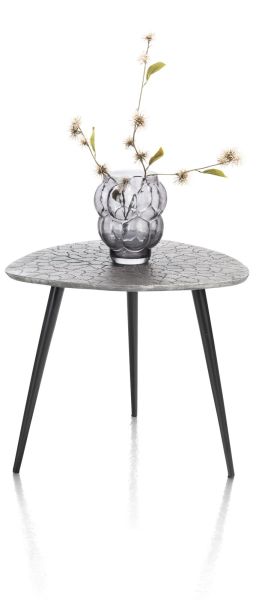Deze salontafel uit collectie Dorval is volledig van metaal en is apart te plaatsen, maar kan ook deel uitmaken van een salontafelset. Deze salontafel meet 53x54cm en heeft een organische vorm. Het tafeltje is 46cm hoog. Het tafelblad van deze tafel is zilverkleurig met een reliëf-textuur en de tafel heeft zwarte metalen poten, maar er is ook een versie met een goudkleurig tafelblad en goudkleurige poten verkrijgbaar. Voor welke ga jij?
