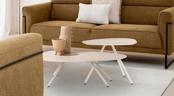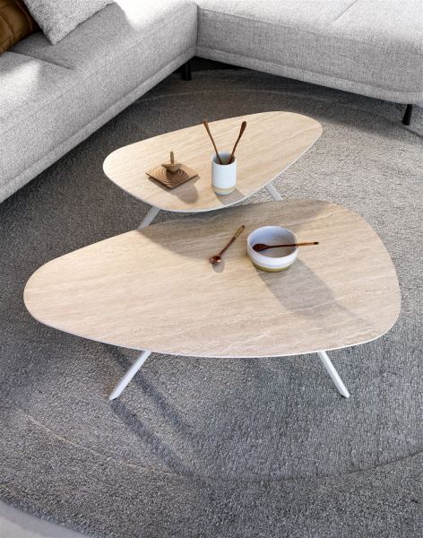 MINTOS is een salontafel met een blad in organische vorm in Primo Laminato (HPL). Het blad heeft een travertin-look en het metalen onderstel is beige. Salontafel MINTOS doorbreekt de rechte lijnen in je woonkamer en past perfect in het interieur van nu. Hij is ook verkrijgbaar in twee kleinere maten; combineer ze samen als mooie set!