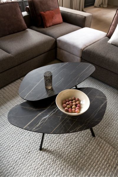 Hoe stijlvol is deze salontafel MONTELLO?! Het zwarte marmerlook blad van keramiek op glas in combinatie met de zwart metalen poten, geeft de tafel een chique uitstraling. MONTELLO heeft een organische vorm en is verkrijgbaar in twee verschillende hoogtes. Mix & match voor een speels effect in jouw woonkamer. Geen fan van zwart? MONTELLO is er ook met een wit marmerlook blad!