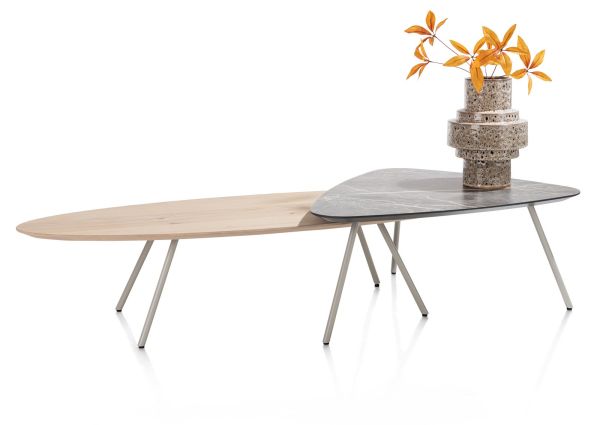 NIORA is een prachtige minimalistische salontafel met een licht grijs organisch gevormd blad, gemaakt van Primo Laminato (HPL) met marmerlook. Hij heeft een afmeting van 85 x 77 cm en staat op een rank metalen onderstel dat verkrijgbaar is in 2 kleuren: silk grey of grafiet. Liever een blad met een natuurlijke uitstraling? NIORA is ook verkrijgbaar met een blad van eikenfineer. Naar wens shop je hem ook in een maatje groter. Zie jij deze elegante eyecatcher al in je woonkamer staan? Tip: NIORA is ook verkrijgbaar als eetkamertafel.