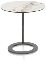 Deze salontafel Vegas komt uit de gelijknamige tafelcollectie en heeft net zoals de eetkamertafels en uitschuiftafels een tafelblad van keramiek op glas. De salontafel heeft een tafelblad van 50cm diameter en is verkrijgbaar in 2 kleuren. Deze versie is uitgevoerd met een tafelblad met een witte marmerlook. Ook het onderstel van deze salontafel is best uniek, want deze salontafel staat op een brede, ronde, metalen poot. Een extra speelse salontafel die perfect werkt in combinatie met de tafelcollectie.