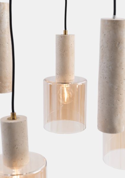 De Pimmy hanglamp van COCOmaison is een schitterende toevoeging aan je interieur. De lamp bestaat uit drie glazen kappen in een zachte beige tint, afgewisseld met twee elegante travertin cilinders. De natuurlijke steentextuur en de subtiele messingkleurige details zorgen samen voor een warme en moderne uitstraling. De verschillende hoogtes van de pendels creëren een speels lichtbeeld dat perfect werkt boven een ronde eettafel, in de hal of boven een keukenblok. Geschikt voor drie E27‑lichtbronnen en twee GU10‑spots én volledig dimbaar, zodat je de sfeer precies kunt afstemmen op het moment. Combineer deze hanglamp met de Pimmy tafel‑ en vloerlamp voor een stijlvolle, samenhangende look in huis.