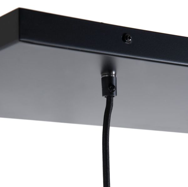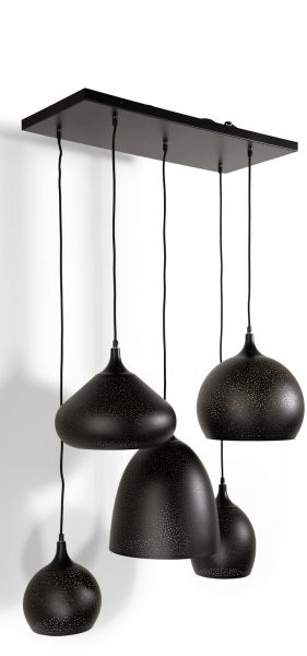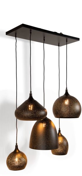 Lamp ARJEN uit de collectie van COCOmaison is niet alleen een stoere eyeacatcher, maar tegelijk een absolute sfeermaker in je woonruimte. Hang hem boven de eetkamertafel en je diners zullen nooit meer hetzelfde zijn! Tegen de muur en het plafond ontstaat namelijk een bijzonder lichteffect zodra je de lamp aanzet. Doordat ARJEN dimbaar is, creëer je in een handomdraai een heerlijke sfeer. De vijf zwart met goudkleurige pendants zijn verstelbaar in hoogte (max. 130 cm) en je shopt ze exclusief lichtbron. ARJEN heeft een rechthoekige plafondplaat van 70 x 30 cm. De totale afmeting van deze lamp is 87 x 44 cm. Bekijk ook eens de andere lampen uit de ARJEN-serie.