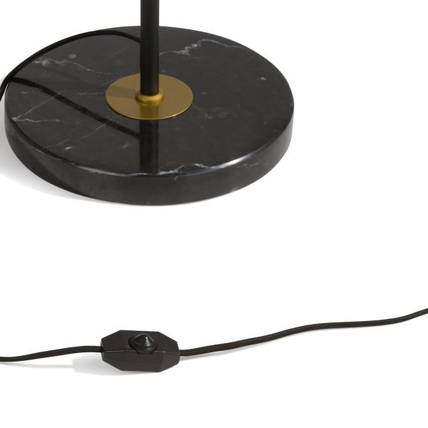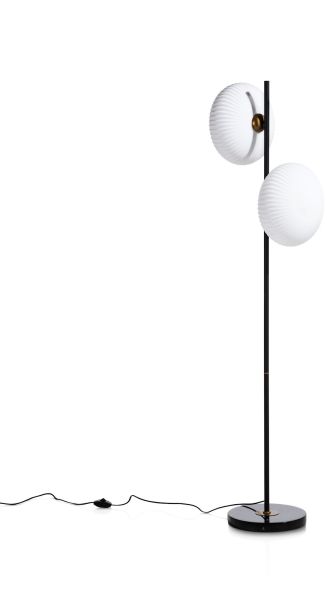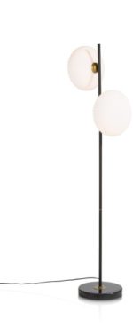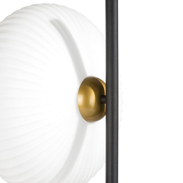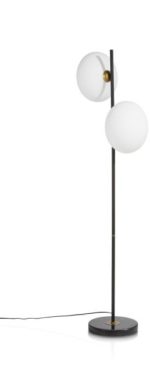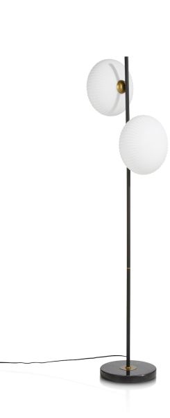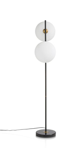 De staande lamp David van COCOmaison is een moderne lamp met een klassieke, vintage look. De twee lampenkappen zijn gemaakt van wit melkglas en lijken geplooid. David heeft een matzwart armatuur met geborsteld goudkleurige accenten en rust op een zwart marmeren voet. Een hanglamp en twee verschillende tafellampen maken deel uit van dezelfde serie.