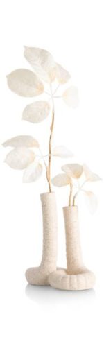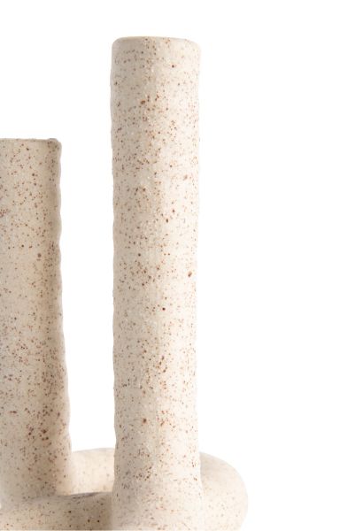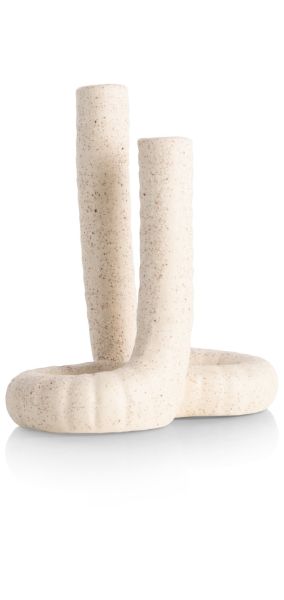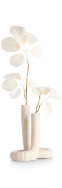 KIKI is een schattig vaasje van COCOmaison in twee verschillende modellen. Beide zijn geïnspireerd op een koord, dat in dit geval twee lussen vormt. De hoogste van dit model is 17 cm, de andere is 15 cm. Het vaasje heeft twee smalle openingen waar je een takje of bloem in kunt zetten. KIKI is gemaakt van polyresin en heeft een crèmekleurige betonlook.