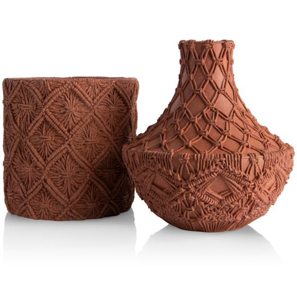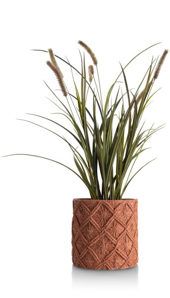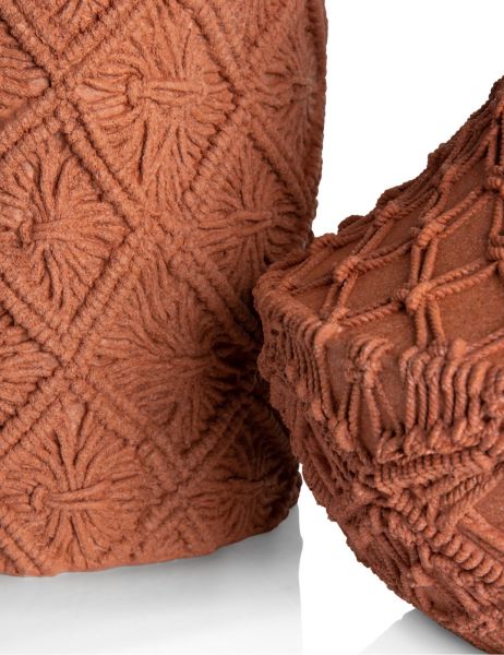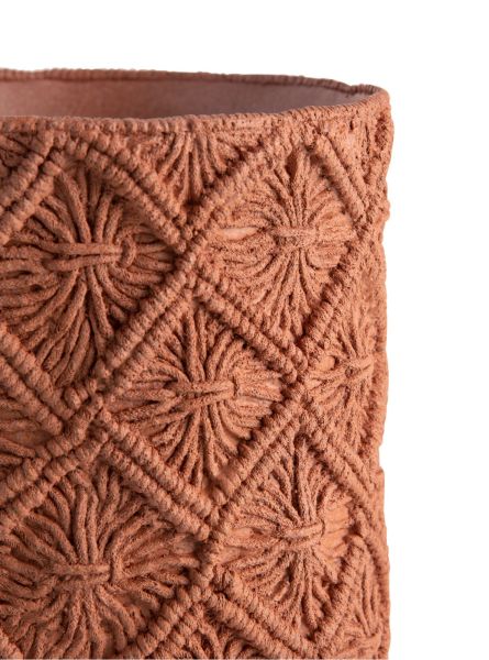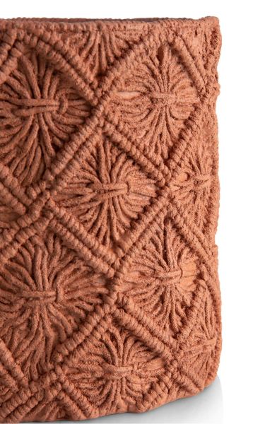 De 70’s maken een comeback in interior design, maar dan wel op een minder uitgesproken en meer verfijnde manier. Deze MAEVE pot van COCOmaison is daarvan een goed voorbeeld. Het is een polyresin pot in terracotta kleur met een macramé reliëf op de buitenkant. De pot is 26 cm hoog en heeft een doorsnede van 28 cm. Een vergelijkbaar motief zie je ook terug op de bijpassende kruikvaas die 33 cm hoog en 31 cm breed is.