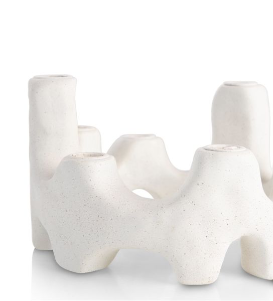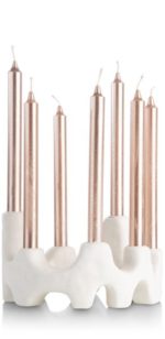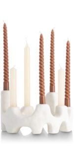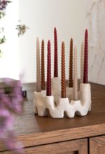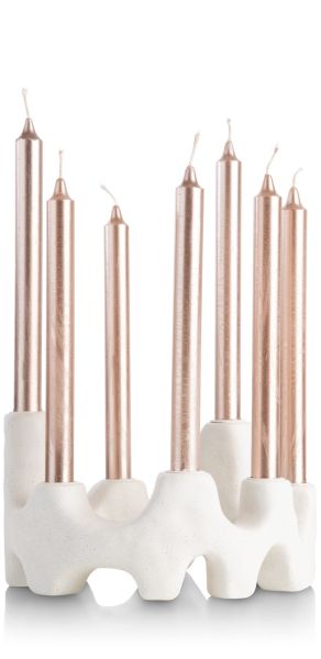 In deze leuke ronde kandelaar van COCOmaison passen maar liefst 9 dinerkaarsen. De JET kandelaar heeft een doorsnede van zo’n 26 cm neutraal en een variabele hoogte tot maximaal 14 cm. De kleur is neutraal wit, dus je kunt er elke kleur kaars in zetten die je wilt of meerdere kleuren combineren. Helemaal trendy wordt het als je spiraal-kaarsen of dip-dye kaarsen gebruikt en wil je variëren met de seizoenen, kies dan bijvoorbeeld geel met Pasen en rode, groene of metallic kaarsen met de feestdagen. Zo heb je het hele jaar rond plezier van deze kandelaar!